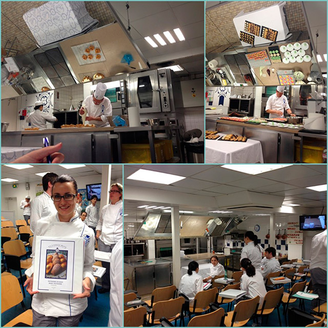 Хоча у допомогу на стінах висять екрани, але все одно хочеться бути ближчим до шефа! Він готує одночасно близько чотирьох десертів (один такий урок триває близько трьох годин). І в нього обов'язково є помічник, помічник, який допомагає шефу, все готує, подає, миє, прибирає. Це колишні студенти, які виявили бажання залишитися ще на 3 місяці у школі, така робота дуже корисна. Можливо, і мені вдасться її отримати) Одна чи дві страви з тих, що готує шеф, мені доведеться приготувати на практиці. Шеф, звісно, каже, яка це страва буде.