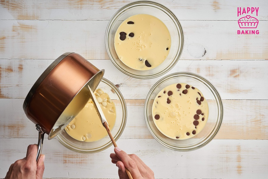 В каждую добавляем шоколад — черный, молочный и белый, вымешиваем до однородности.