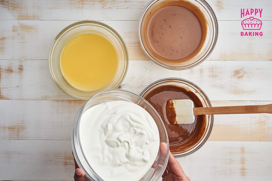 Когда основа с шоколадом охладится до температуры 35°С, то есть, вы не будете ощущать тепло, прикасаясь к миске, то основу можно соединять со взбитыми сливками. Добавляем по 100 мл сливок в каждую миску с шоколадом. Баваруа готов.
