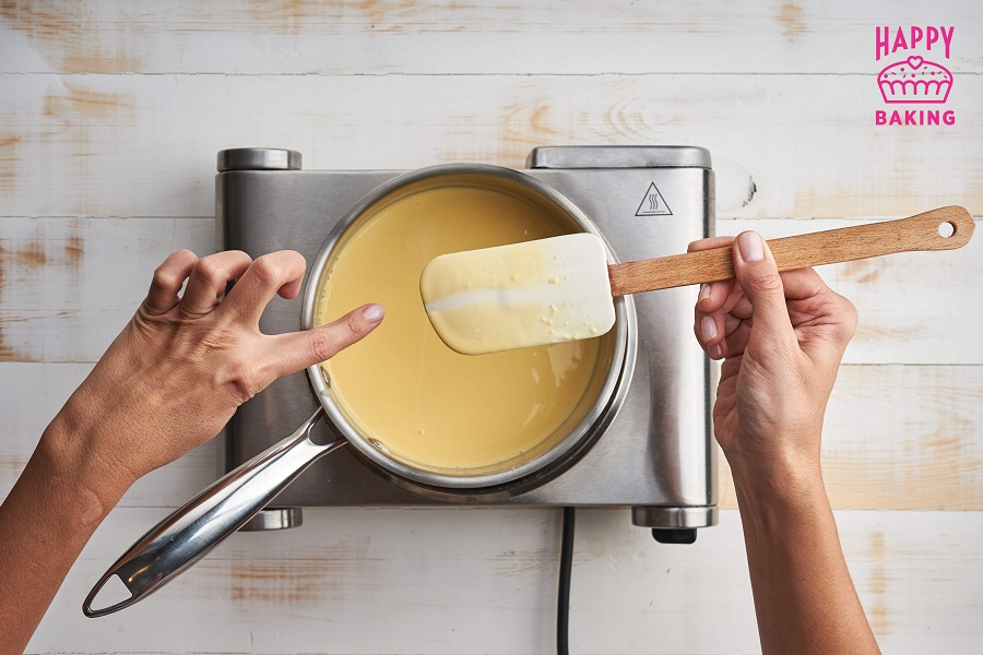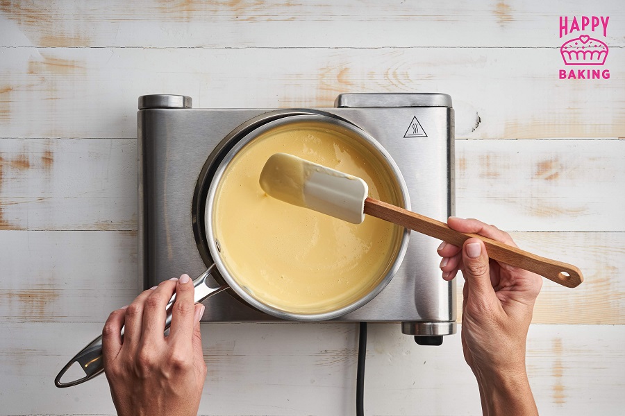 При постоянном помешивании варим до температуры 84°С — крем будет становиться плотнее.