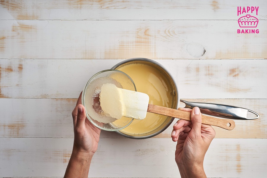 Снимаем крем с огня, соединяем с замоченным, набухшим желатином.