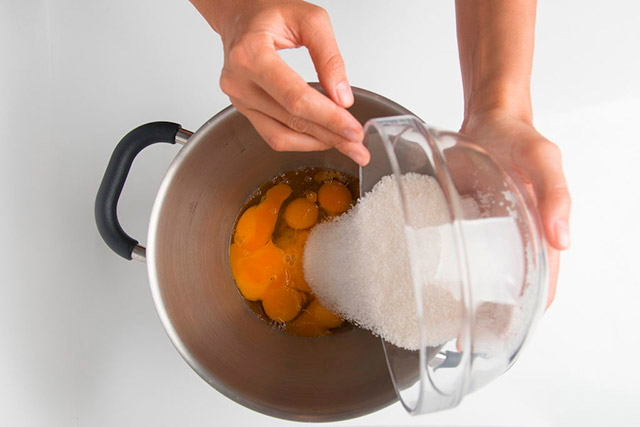 Готовим бисквит для шоколадного торта — шоколадный женуаз. Для этого нам понадобится комбайн с венчиком или миксер. Соединяем яйца с сахаром и взбиваем 8-10 минут до максимальной плотности.