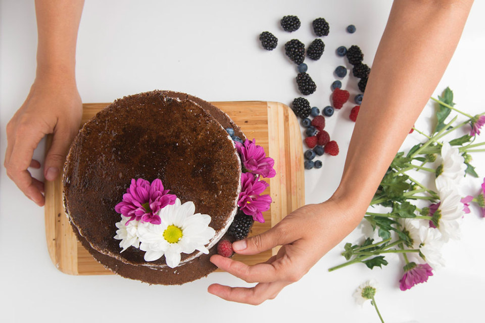 Ставим один ярус на другой, скрепив их между собой небольшим количеством крема. Для того, чтобы бисквит был блестящим, его необходимо промазать тонким слоем нейтральной глазури или абрикосовым джемом. Декорируем шоколадный торт свежими ягодами и цветами. И не забудьте про яркую ленточку!