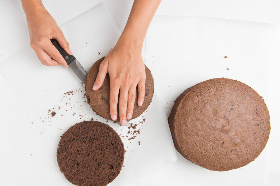 С помощью ножа, лезвием от себя, отделяем бисквит от формы.