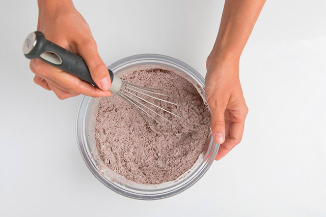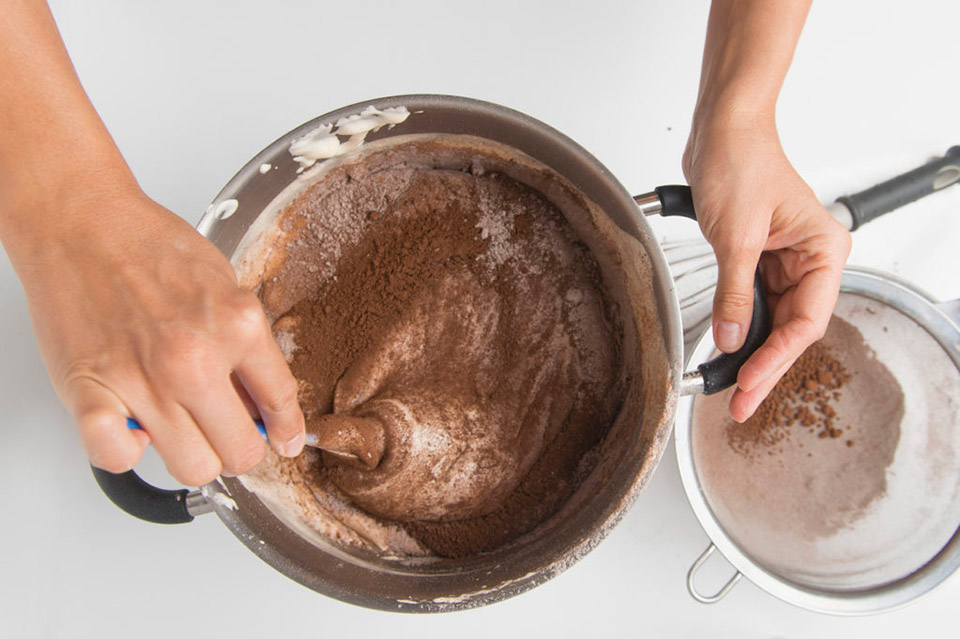 Соединяем сухие ингредиенты: муку и какао.