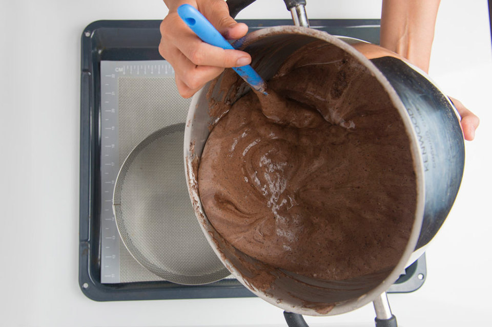 С помощью сита небольшими порциями добавляем сухие ингредиенты к взбитым яйцам и очень деликатно, не спеша, деревянной или силиконовой лопаточкой вымешиваем тесто.