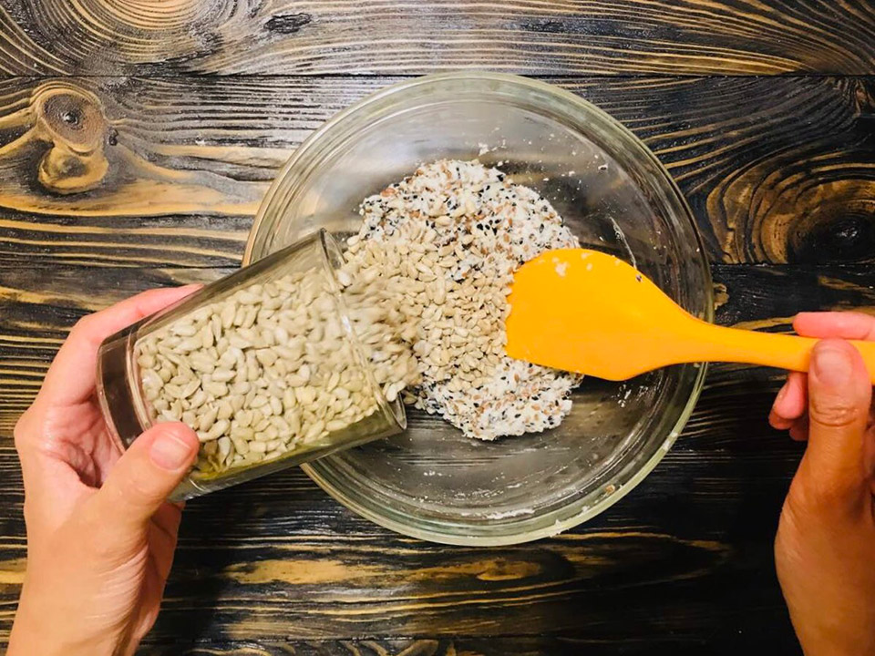 Добавляем семена льна, кунжут и семечки подсолнечника. Вымешиваем, чтобы все семечки распределились равномерно.