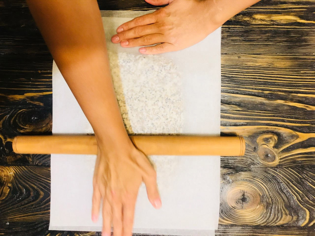 Накрываем еще одним листом пергамента и раскатываем в пласт толщиной 5-6 мм.
