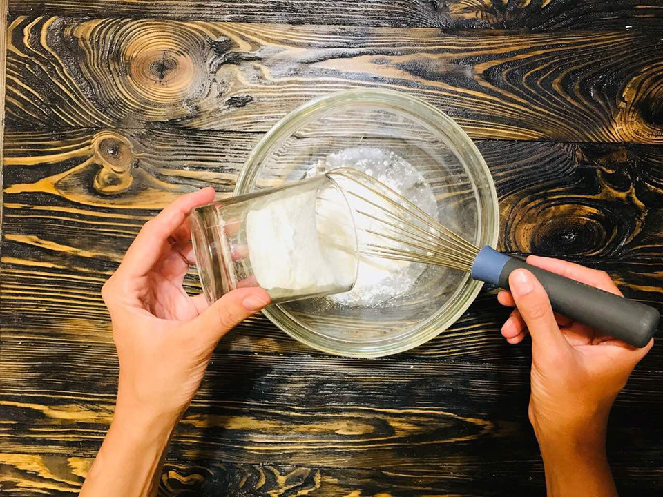 Добавляем рисовую муку, перемешиваем венчиком до однородности. Добавляем кокосовое масло - масса сразу станет более гладкой.