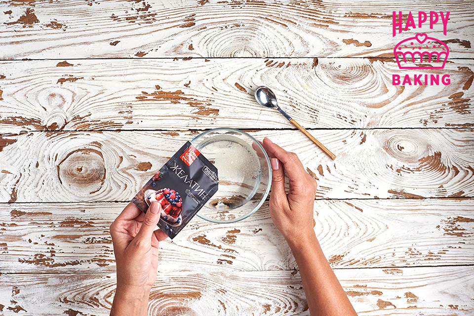 Замачиваем желатин «Happy Baking» водой комнатной температуры (1:6), убираем на 10-15 минут
