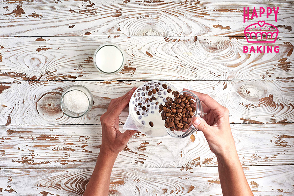 Сливки, кофейные зерна и молоко соединяем в сотейнике. Прогреваем до парения (образования пара).