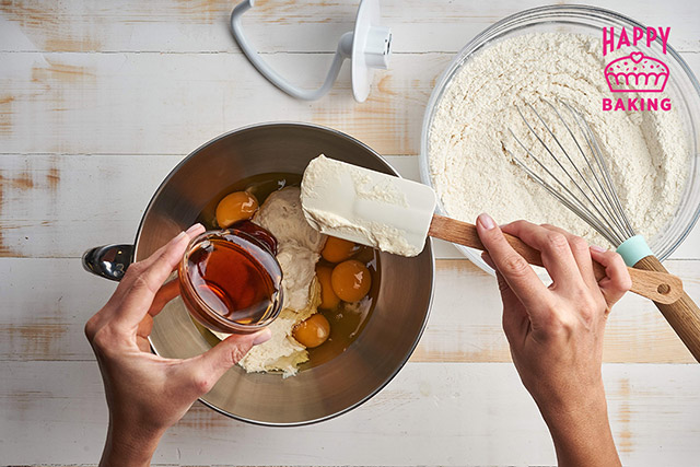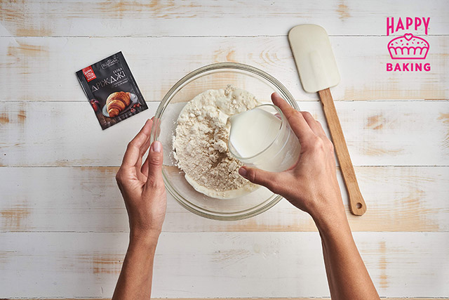 Затем добавляем муку, соль, сахар, термостойкий ванильный сахар «Happy Baking», Extra дрожжи «Happy Baking», перемешиваем.