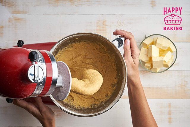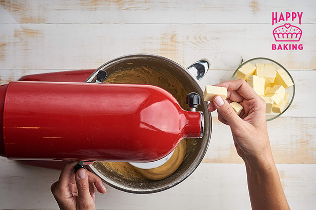Добавляем в тесто для кулича небольшими порциями холодные (!) кубики сливочного масла.