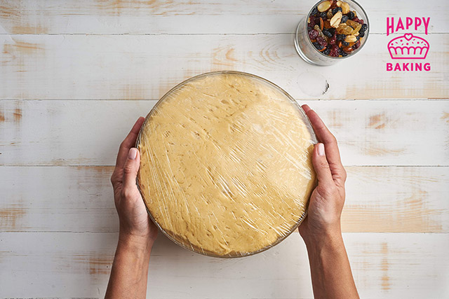 Обминаем тесто. Снова накрываем пленкой (можно поместить тесто в пластиковый контейнер) и убираем в холодильник на 12 часов для второго подъема.