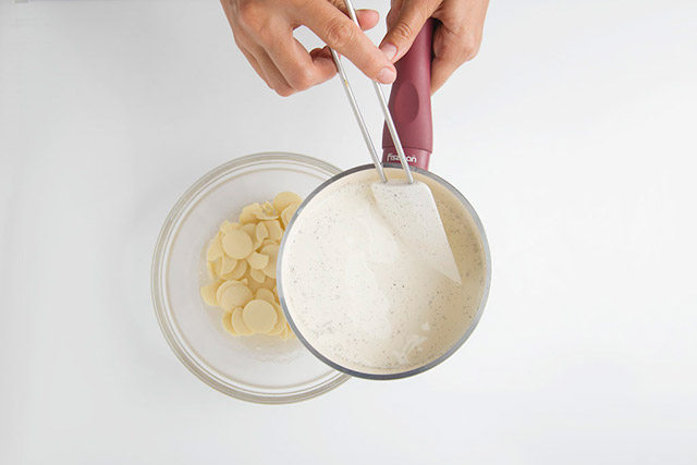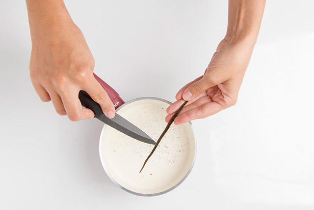 Для приготовления панна котты отправляем в сотейник молоко, сливки, семена ванили и доводим массу до кипения.