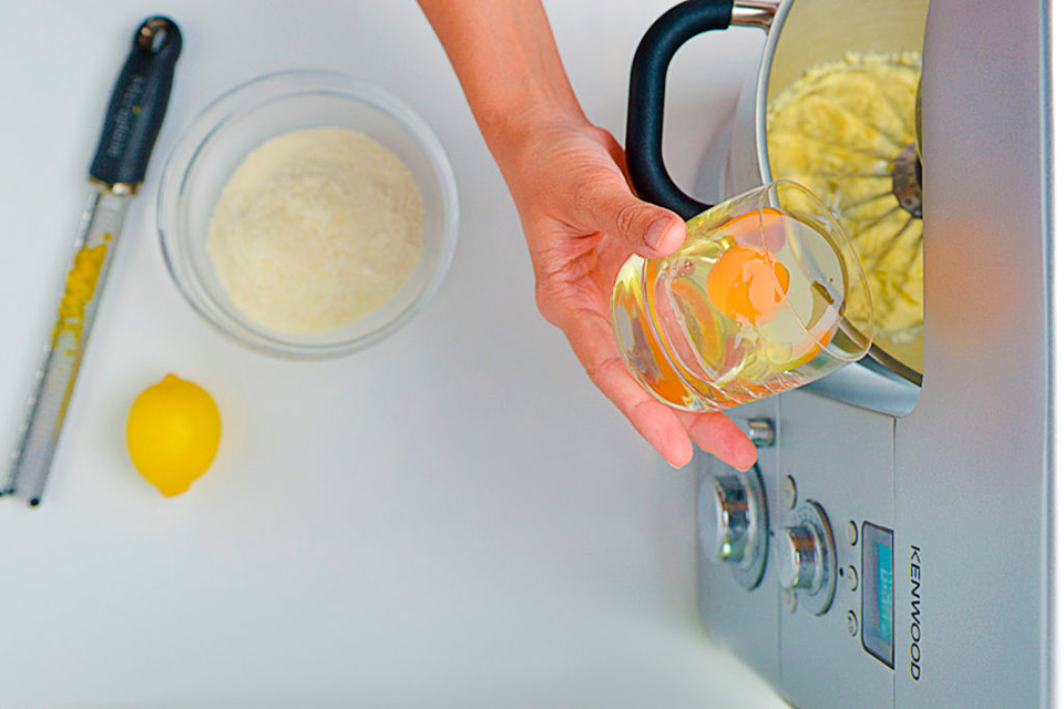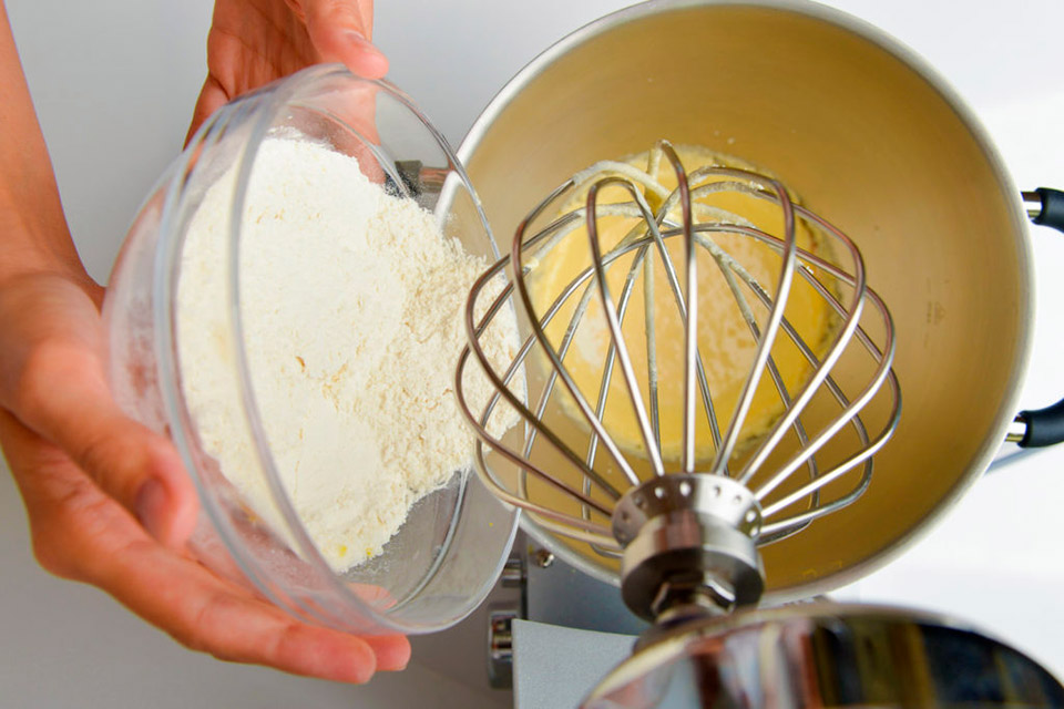 Соединяем все сухие ингредиенты: муку, разрыхлитель, кокосовую стружку, цедру лимона, краситель (по желанию).