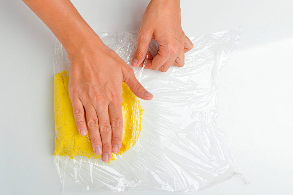 Готовое тесто оборачиваем в пищевую пленку и убираем в холодильник на час.