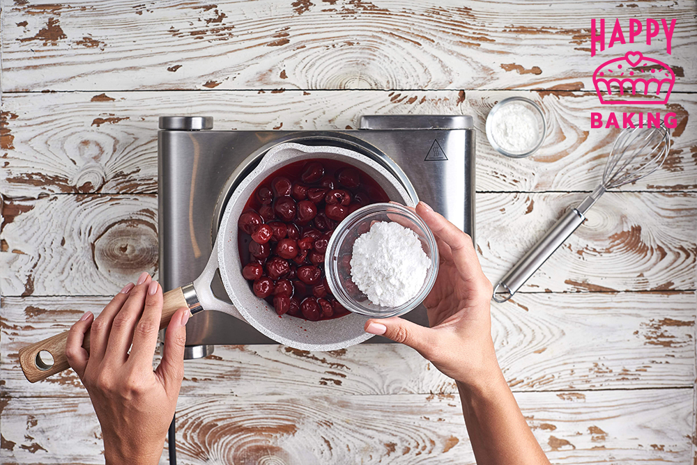 Для приготовления вишневой начинки смешиваем все ингредиенты. Отправляем в сотейник. И при постоянном помешивание, на среднем огне, доводим до кипения и исчезновения привкуса крахмала. Провариваем 1 минуту.