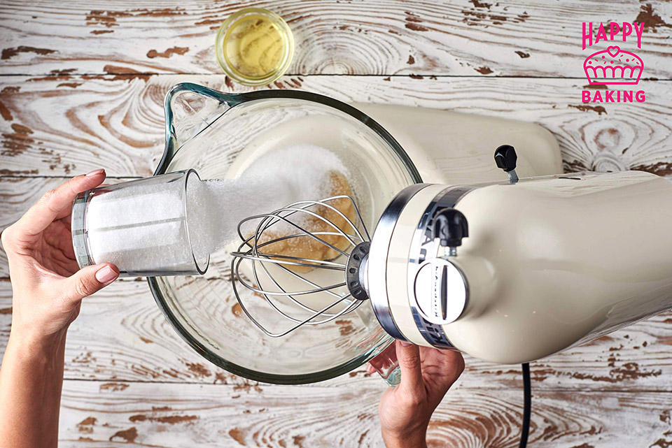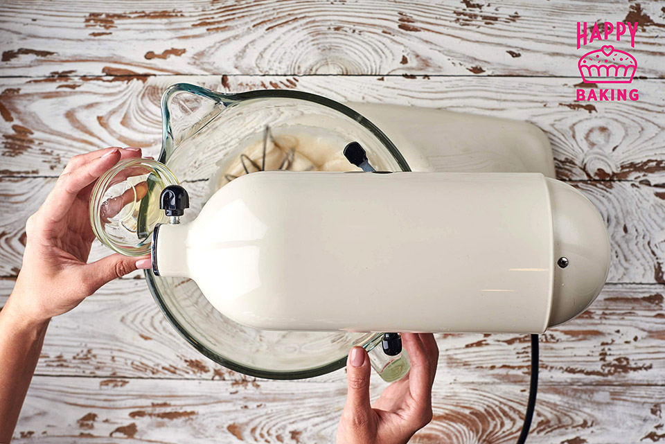 Збиваем в комбайне насадкой «Венчик». Масса должна посветлеть и увеличиться в объеме. Добавляем белок. Продолжаем взбивать на небольшой скорости, чтобы не перебить массу.