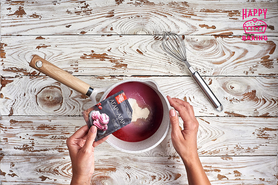Отправляем параллельно в сотейник пюре смородини, воду, агар-агар силой геля 1200 г/см2 «Happy Baking» и сахар. Все перемешиваем.