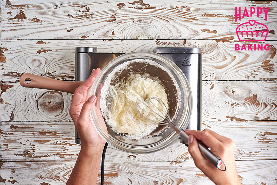 Доводим до температуры от 55 до 60 градусов, то есть, до полного растворения сахара, постоянно помешивая. Важно чтобы белок не свернулся.