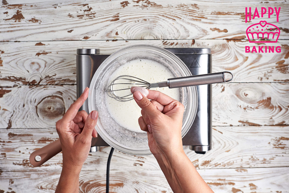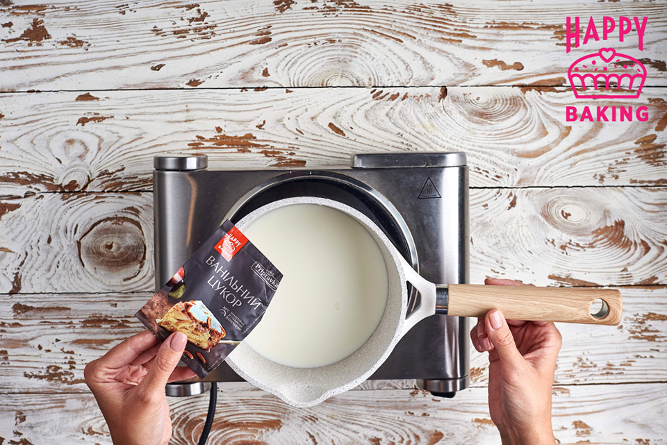 Молоко прогреваем до парения в сотейнике и добавляем в него термостойкий ванильный сахар.