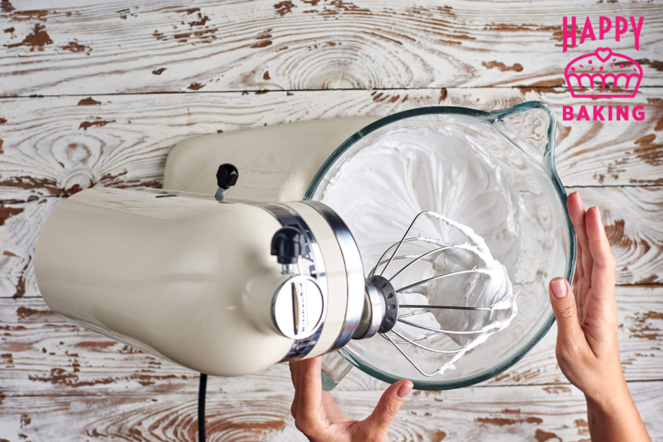 Перекладываем эту массу в чашу для взбивания и взбиваем венчиком до устойчивых пиков.