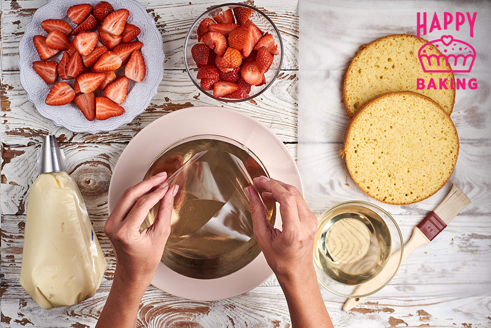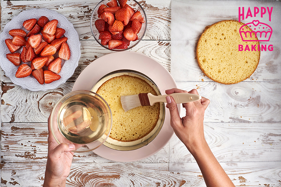 Собираем торт. Готовый бисквит разрезаем на 2 части, пропитываем сиропом. Клубнику разрезаем на 2 части и собираем торт.