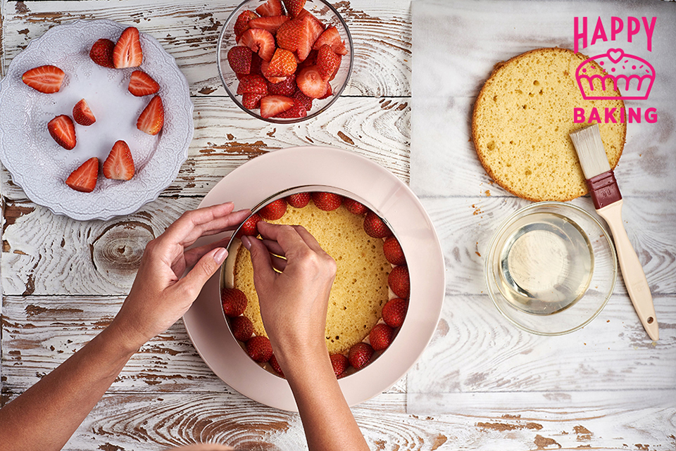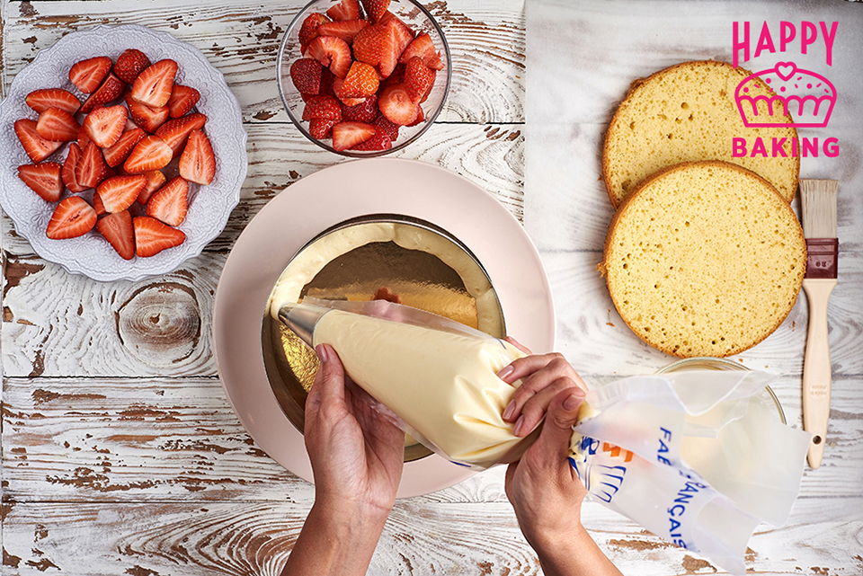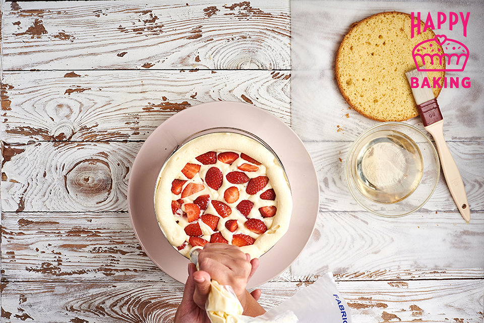 Заполняем середину бисквита кремом, сверху выкладываем клубнику. Пустоты также заполняем кремом.