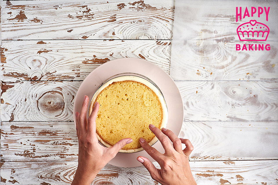 Бисквит выливаем в металлическое кольцо, диаметром 16 см и отправляем выпекаться в разогретую до 160 градусов духовку, до готовности, примерно 35-40 минут.