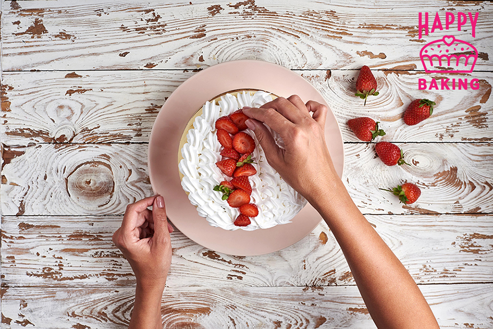 Выкладываем на крем клубнику срезом к бордюрной ленте.