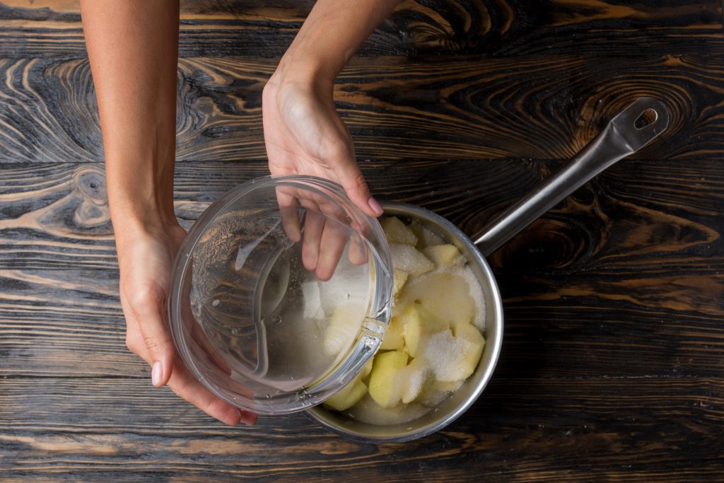 Заливаем водой, доводим до кипения и провариваем 20-25 минут на среднем огне. Яблоки должны пропитаться сиропом и стать прозрачными.