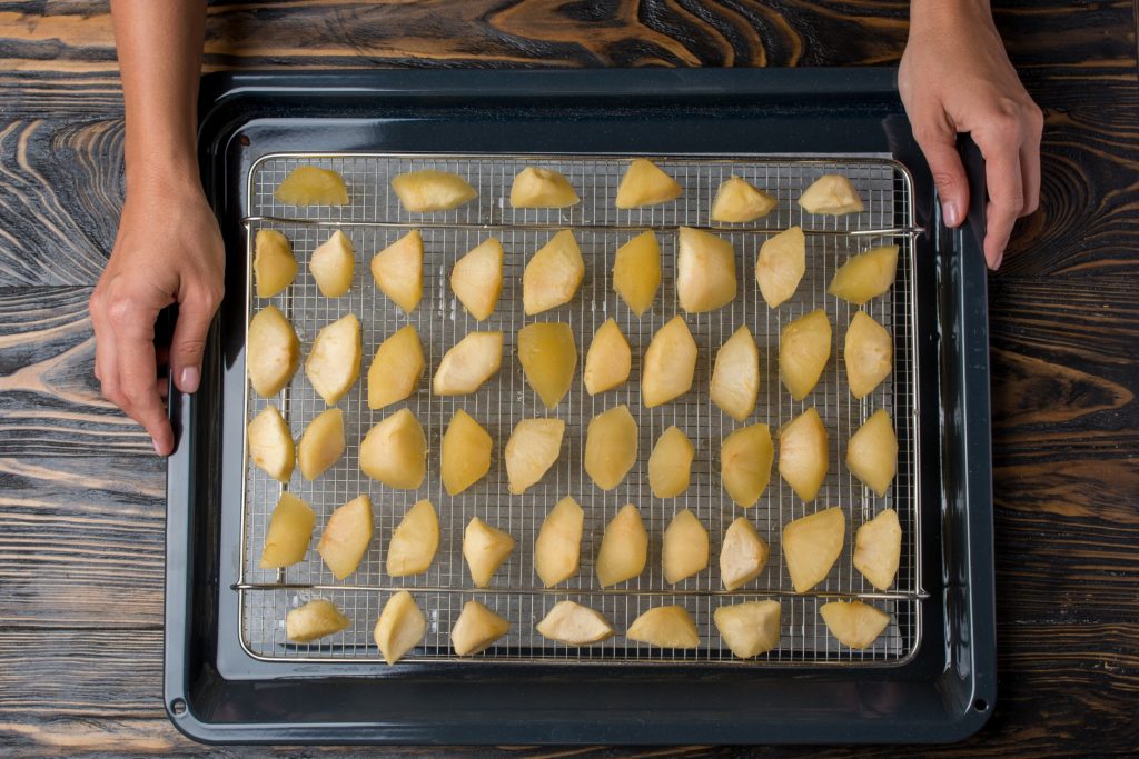 Выкладываем яблоки на решетку и сушим в духовке при температуре 80°С в течение 4-5 часов. Можно воспользоваться дегидратором.