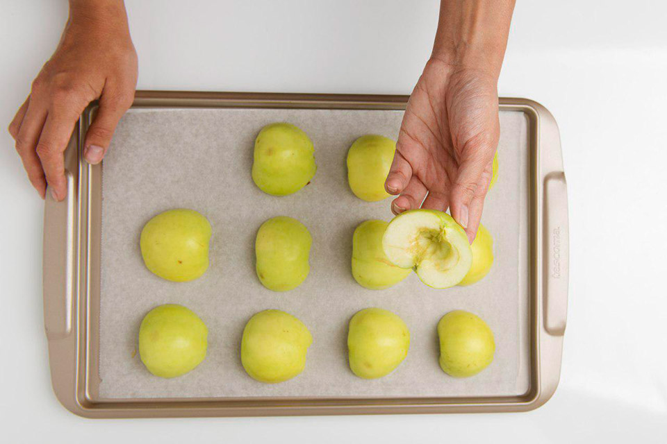 Для приготовления зефира разрезаем яблоки пополам, вычищаем середину. Выкладываем на пергамент срезом вниз. Запекаем при температуре 170°С 25-30 минут. Запеченные яблоки с кожурой перебиваем блендером до состояния пюре и пропускаем через сито.
