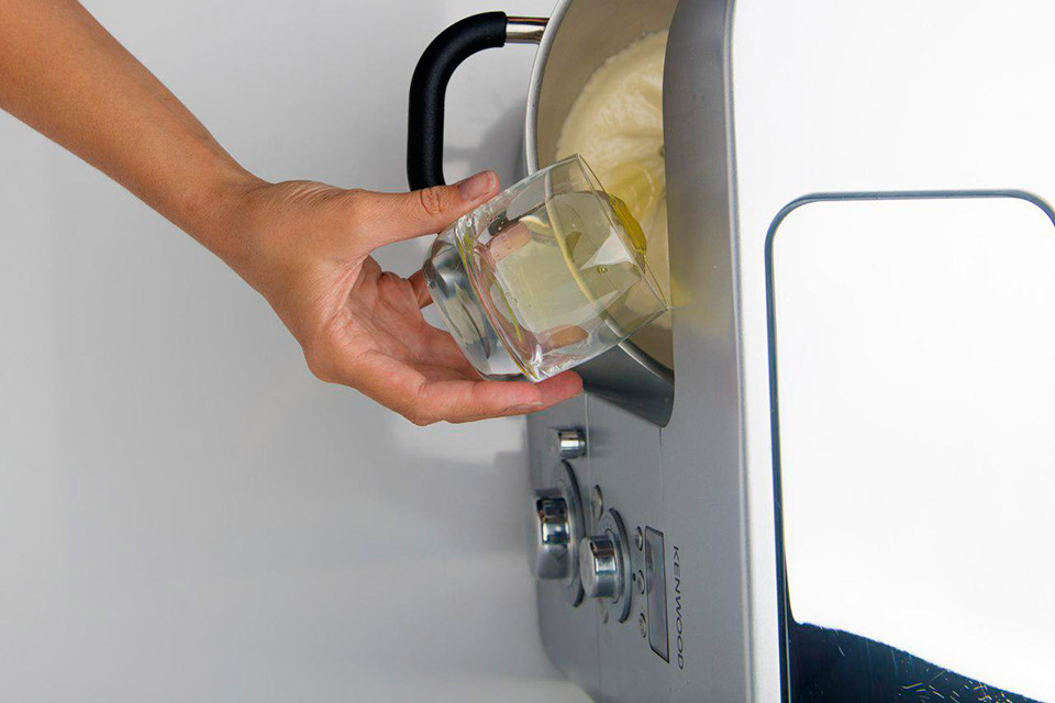Взбиваем яблочное пюре в комбайне (насадка "венчик") или миксером: оно должно слегка увеличиться в объеме и посветлеть. Постепенно добавляем белок и продолжаем взбивать еще около 5 минут.